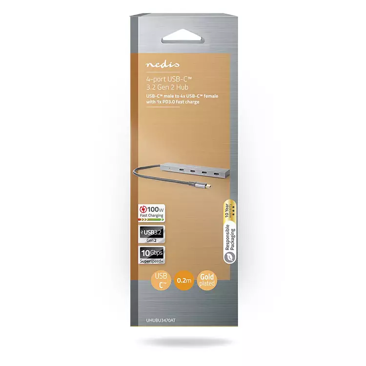 Nedisin tyylikkään ja käytännöllisen USB-C-hubin avulla yhdistät neljä USB-C-laitetta yhteen USB-C-porttiin. Ulkoista virtalähdettä ei tarvita. Alumiinista valmistettu laite tukee enintään 100 W PD3.0-pikalatausta, 10 W esiladattu telakointilaitteille. Sininen LED-indkaattori. Tuloliitäntä: 1 x USB-C Lähtöliitännät: 4 x USB-C Tuettu tekniikka: USB 3.2 Gen 2, taaksepäin yhteensopiva USB 3.0/2.0 kanssa Tiedonsiirtonopeus: 10 Gb/s Mitat: 235 x 10 x 30 mm Väri: antrasiitti Plug & Play