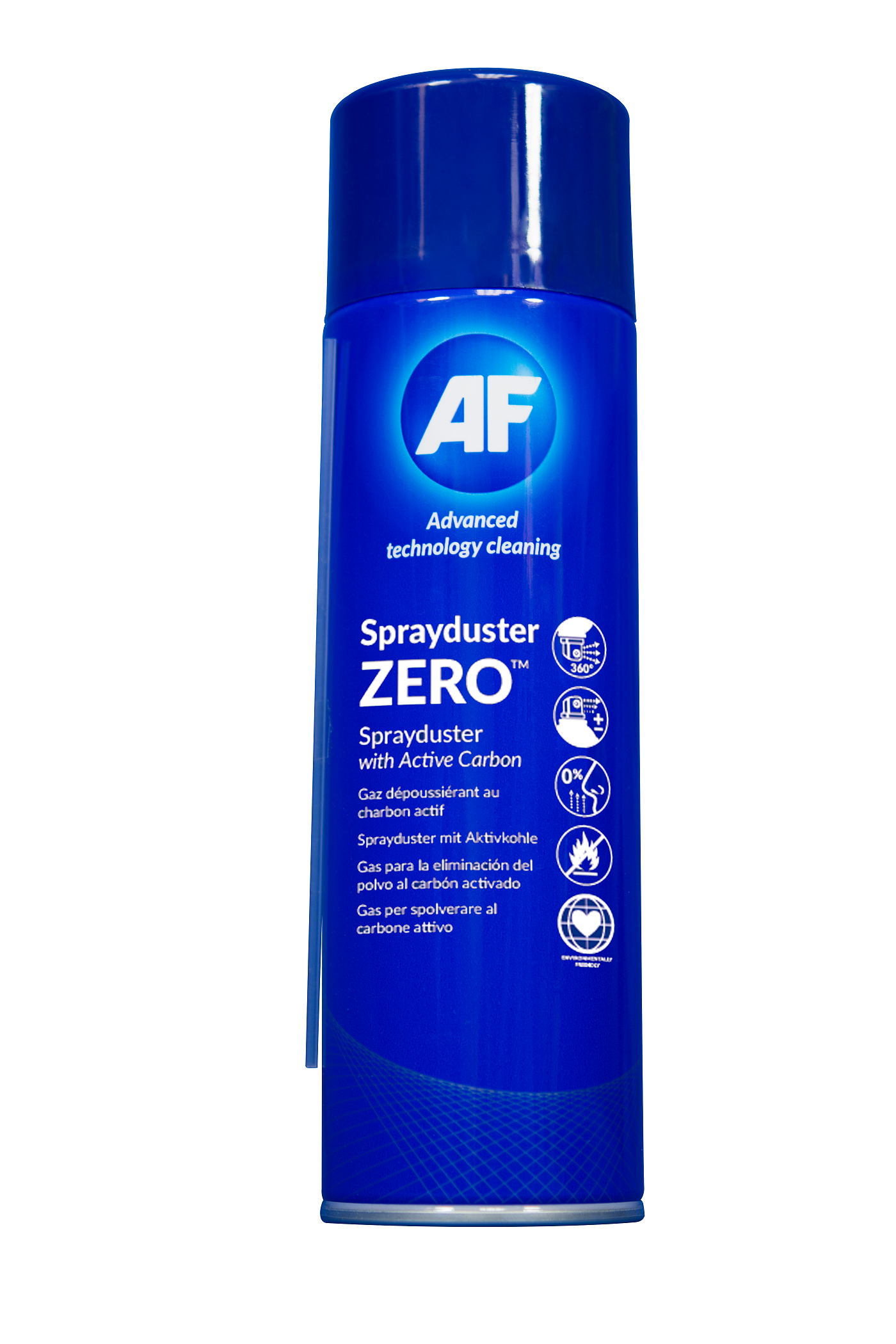AF Sprayduster ZERO Invertible. Soveltuu erityisesti herkille komponenteille ja pienelektroniikalle. Ensimmäinen täysin turvallinen ja ympäristöystävällinen aktiivihiilipohjainen ilmanpaineella toimiva puhdistus-spray.