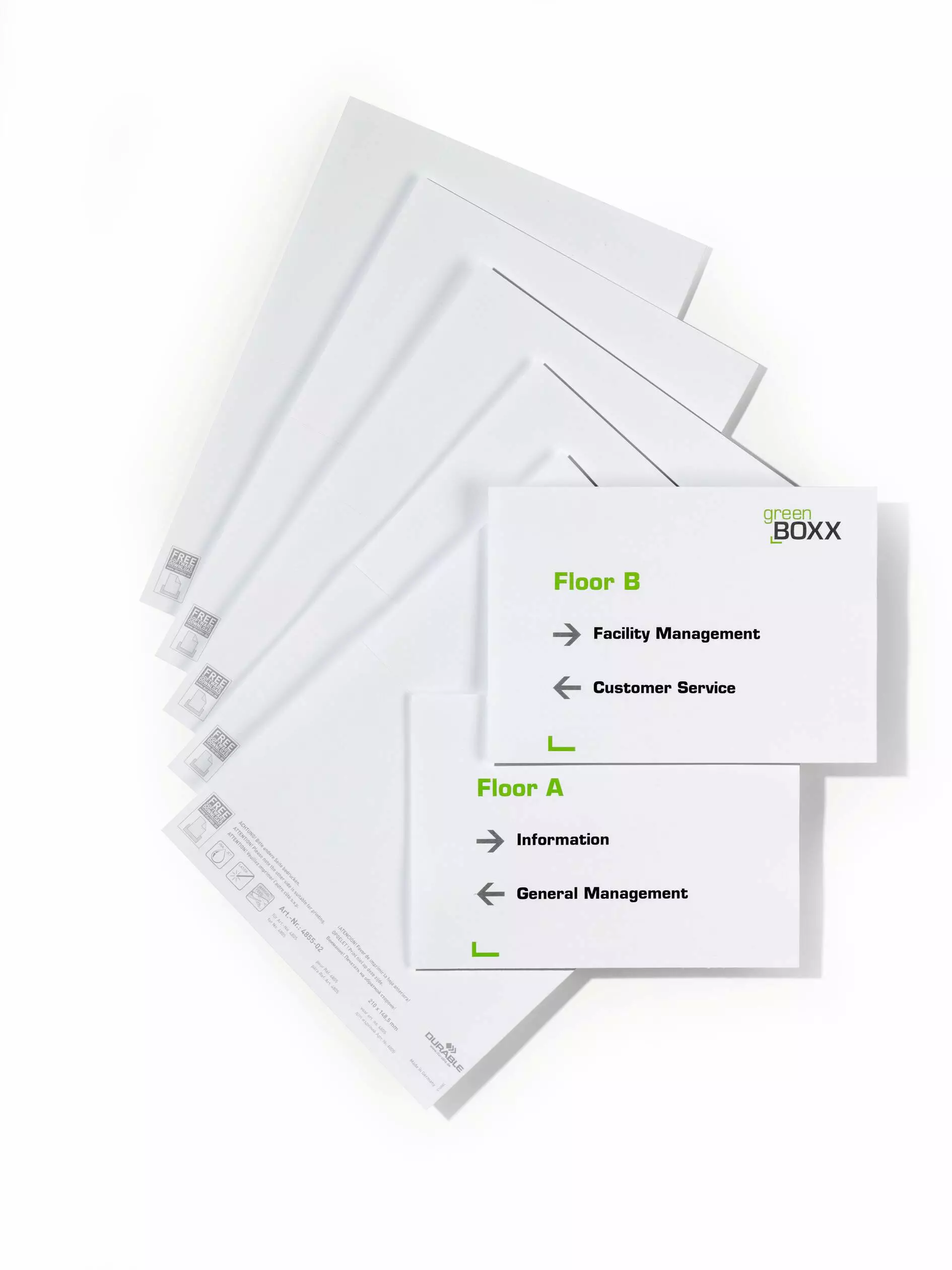 Durable PC-tulostettavat paperiarkit ovilevytuotteisiin nro 4805 ja 4866. Sopii kaikkiin yleisesti saatavilla oleviin laser- ja mustesuihkutulostimiin ja kopiokoneisiin. Mikrorei'itetyt välilevyt helppoon irrotukseen. 20 lisäosaa 10 arkilla.