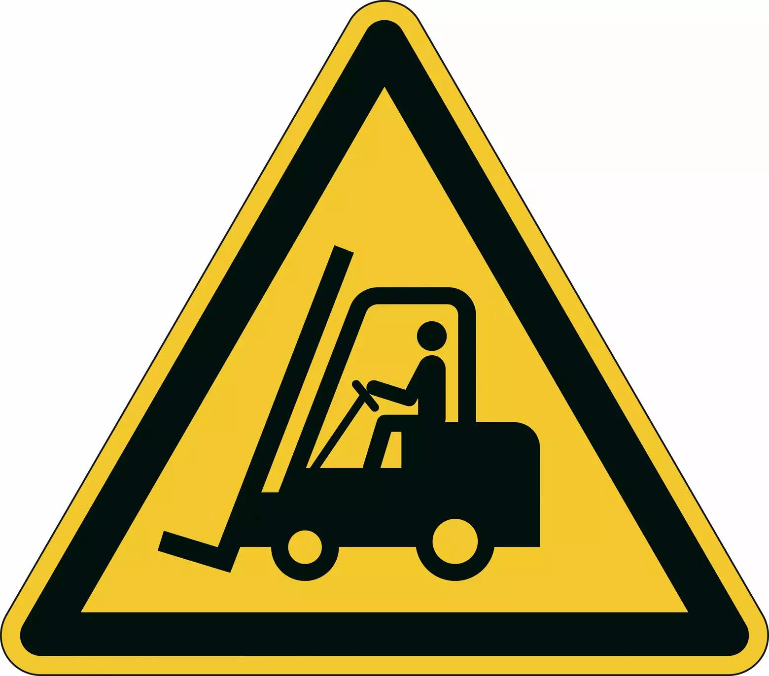 Symboli: ”Varoitus! Trukit”, W014 standardin ISO 7010 mukaisesti. Itseliimautuva, rekisteröity turvamerkintä lattioille sisätiloissa, esim. varastoissa, jakelukeskuksissa, tuotannossa jne. Kulutusta kestävä ja kestävä.