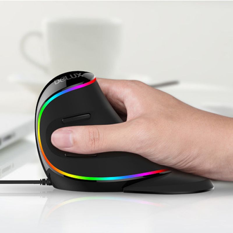 Delux XL on ergonominen 5-näppäiminen pystyhiiri. Muotoilunsa ansiosta käsi asettuu luonnolliseen “tervehdys”-asentoon, joka vähentää ranteen rasitusta. Hiiressä on irroitet-tava tukiosa takana ja vieritysrullassa klikkaustoiminto.