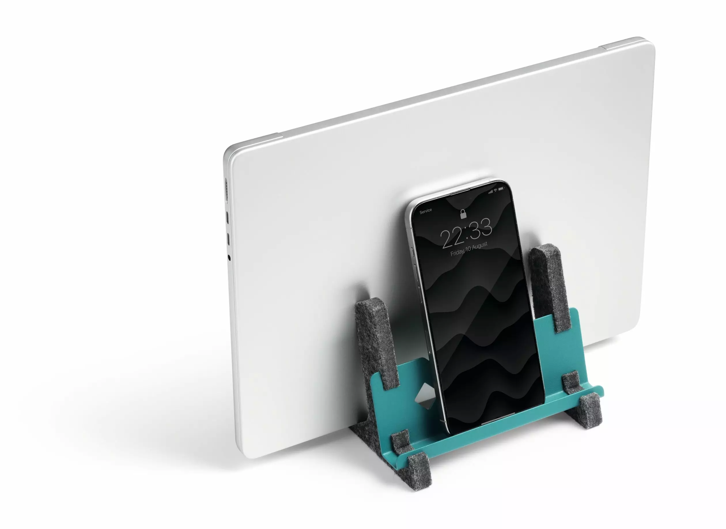 Teline 13"-17" kannettaville tietokoneille ja MacBookeille pystyasennossa. Valmistettu 60 % kierrätetystä PET-huovasta ja jauhemaalatusta teräksestä.