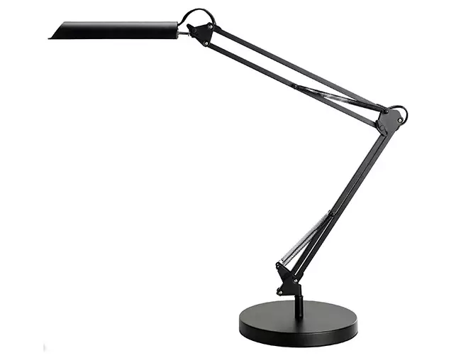 LED-työpöytävalaisin. Varsi nivelillä ja jousikuormituksella mahdollistaa säädöt. Paketissa sekä tukeva jalusta 23 cm että pöytäkiinnike. Valolla 3 eri kirkkautta. Valolähde 9W LED, 800 lumen. Varsi 36+36 cm, lamppu 23 cm. Materiaali metalli/ABS-muovi. Musta. Takuu 2 v. Valonlähdettä ei voi vaihtaa.