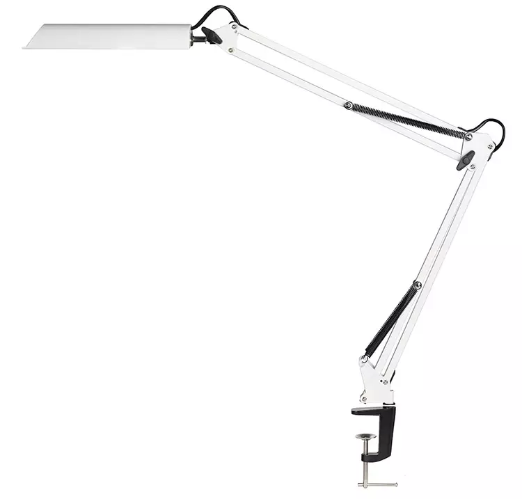 LED-työpöytävalaisin. Varsi nivelillä ja jousikuormituksella mahdollistaa säädöt. Paketissa sekä tukeva jalusta 23 cm että pöytäkiinnike. Valolla 3 eri kirkkautta. Valolähde 9W LED, 800 lumen, värilämpötila 3000 kelvin. Varsi 36+36cm, lamppu 23cm. Materiaali metalli/ABS-muovi. Valkoinen Valonlähdettä ei voi vaihtaa. Käyttöikä jopa 50 000 tuntia. Takuu 2 vuotta.