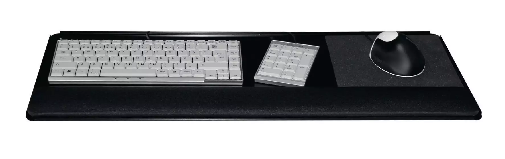 Metallialustalla oleva pehmeä rannetuki antaa hyvän tuen molemmille ranteille sekä näppäimistön että hiiren kanssa työskenneltäessä. Tämä ehkäisee näyttöpäätetyön aiheuttamia ranteiden sekä niska- ja hartiaseudun rasitusvaivoja. Ergonomisessa rannetuessa on pehmeä täyte ja pintamateriaalina toimii kulutusta kestävä ja helppohoitoinen, teflonkäsitelty urheilukangas Teno PS100%. Kotimaisessa rannetuessa on optiselle hiirelle optimoitu alusta. Tukeva metallirakenne voidaan tarvittaessa ruuvata pöytään kiinni. Alustan mitat: leveys 700 mm x syvyys 280 mm. Rannetuen mitat: korkeus 5-23 mm x syvyys 90 mm.