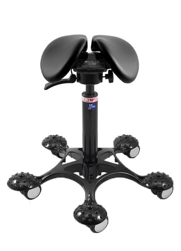 Kaksiosaisella satulatuolilla istut puoliseisovassa, aktiivisessa ja tasapainoisessa asennossa. Istuimen kulma saa lantion kääntymään neutraaliin pystyasentoonsa, jolloin selkaranka ja ylävartalo pysyvät ryhdikkäinä ilman lihastyötä. Voit istua hyväryhtisesti koko päivän, koska genitaalialueelle ei kohdistu liiallista lämpöä tai haitallista painetta, joten sinun ei tarvitse kääntää lantiota taaksepäin. Myös nestekierto toimii hyvin.