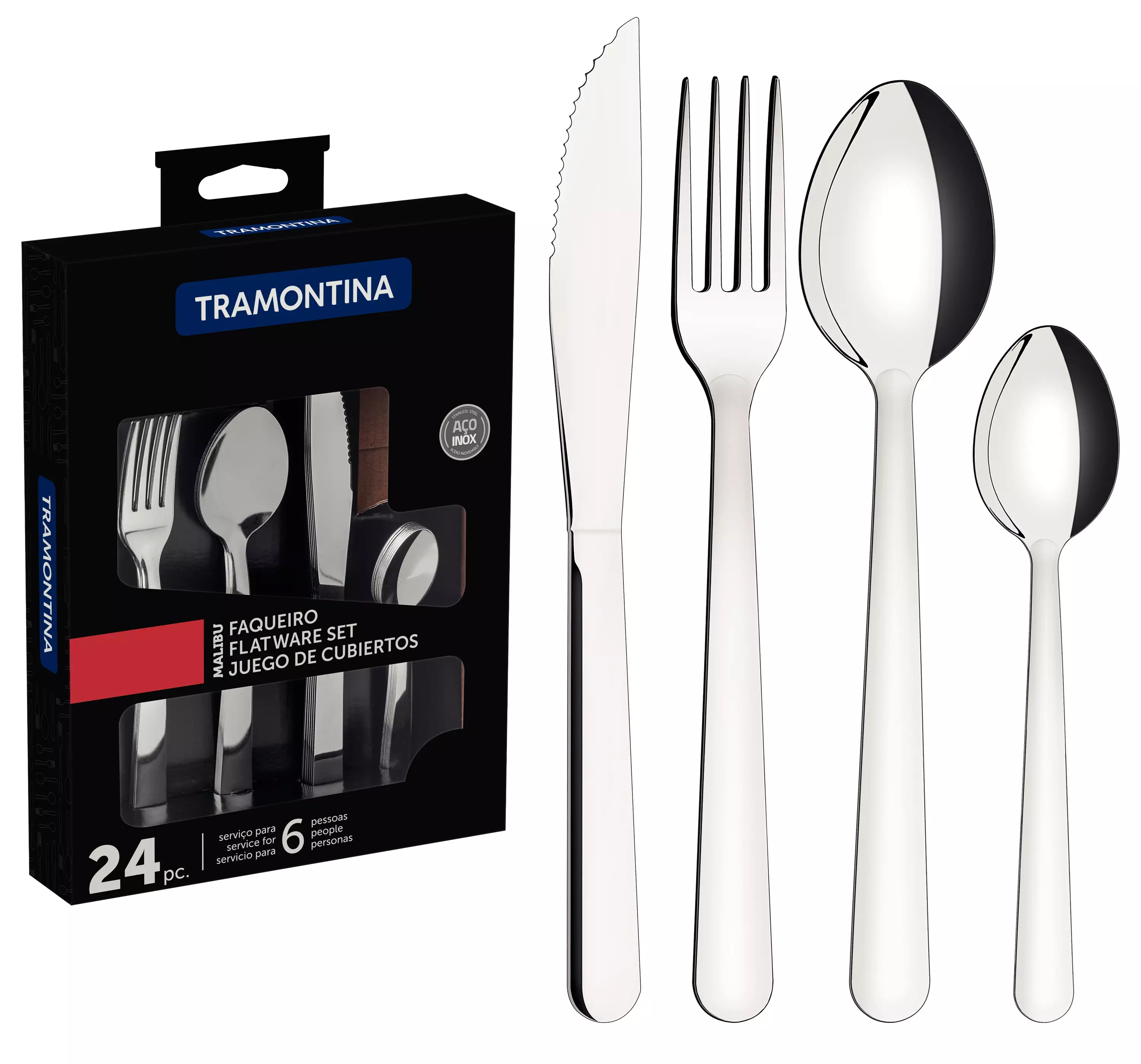 24-osainen Malibu aterinsetti on valmistettu ruostumattomasta teräksestä. Setti sisältää 6 kpl pihviveitsiä, 6 kpl haarukoita, 6 kpl ruokalusikoita ja 6 kpl teelusikoita. Aterimet ovat konepesun kestäviä. Perinteikäs yritys Tramontina on perustettu vuonna 1911 Etelä-Brasiliassa kuuluisalla Pampan alueella, joka on tunnettu Brasilialaisen grillauksen eli Churrascon synnyinpaikkana. Churrascon juuret juontavat 1700-luvulle, jolloin karjapaimenilla eli Gauchoilla oli tapana grillata lihaa maahan painetuissa vartaissa nuotion äärellä. Tramontina on ennen kaikkea tunnettu pihviveitsistään. Yritys valmistaa vuosittain yli 90 miljoonaa keittiöveistä sekä 500 miljoonaa aterinta tehden siitä maailman suurimman pihviveitsivalmistajan. Tänä päivänä yli 10 000 henkeä työllistävä Tramontina on kuuluisa erinomaisten tuotteidensa lisäksi vastuullisuudestaan, niin työntekijöiden, ympäristön kuin paikallisten alueiden kehittäjänä.