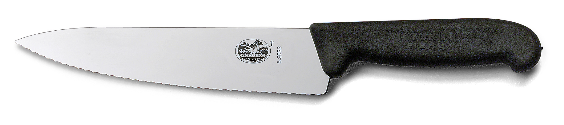 Keskikokoinen sahateräinen kokkiveitsi. Kokkiveitsi on keittiön yleisveitsi. Monipuolinen yleisveitsi, jonka pituus riittää jo nopeaan silppuamiseen (kärki koko ajan kiinni leikkualustassa). Sahateräisenä toimii myös leipäveitsenä. Terä on valmistettu parhaasta ruostumattomasta erikoisveitsiteräksestä. Terä on suhteellisen leveä ja tukeva ja tietysti huipputerävä. Fibrox-kahva on kuituvahvistettua nylonia, joka kestää 150°C:n kuumuuden. Muodoltaan kahva on Victorinoxin mainioksi todettua ammattimallia. Mattapintaisessa kahvassa ote pitää, vaikka kahva olisi märkä tai öljyinenkin.