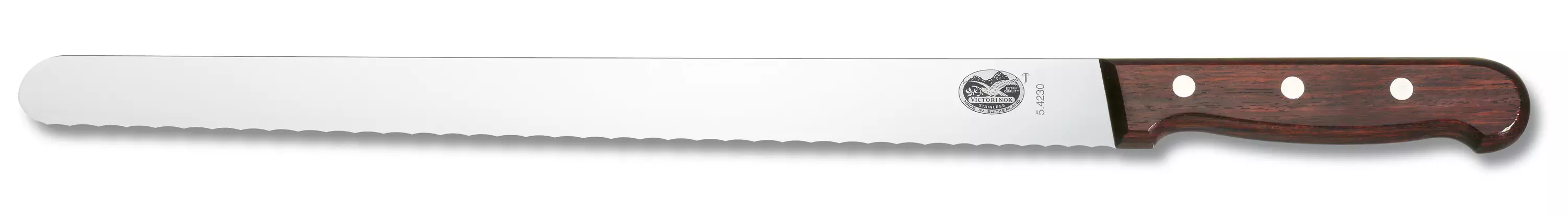 Pitkä konditoriaveitsi esimerkiksi kakuille tai isoille leiville. Veitsen kahva on aitoa luonnonpuuta.