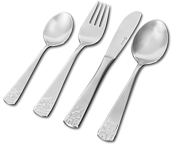 Lahjapakkaus. Sisältö: pikkulusikka, ruokalusikka, ruokahaarukka ja ruokaveitsi lasten kokoa. Kivat eläinaiheet.