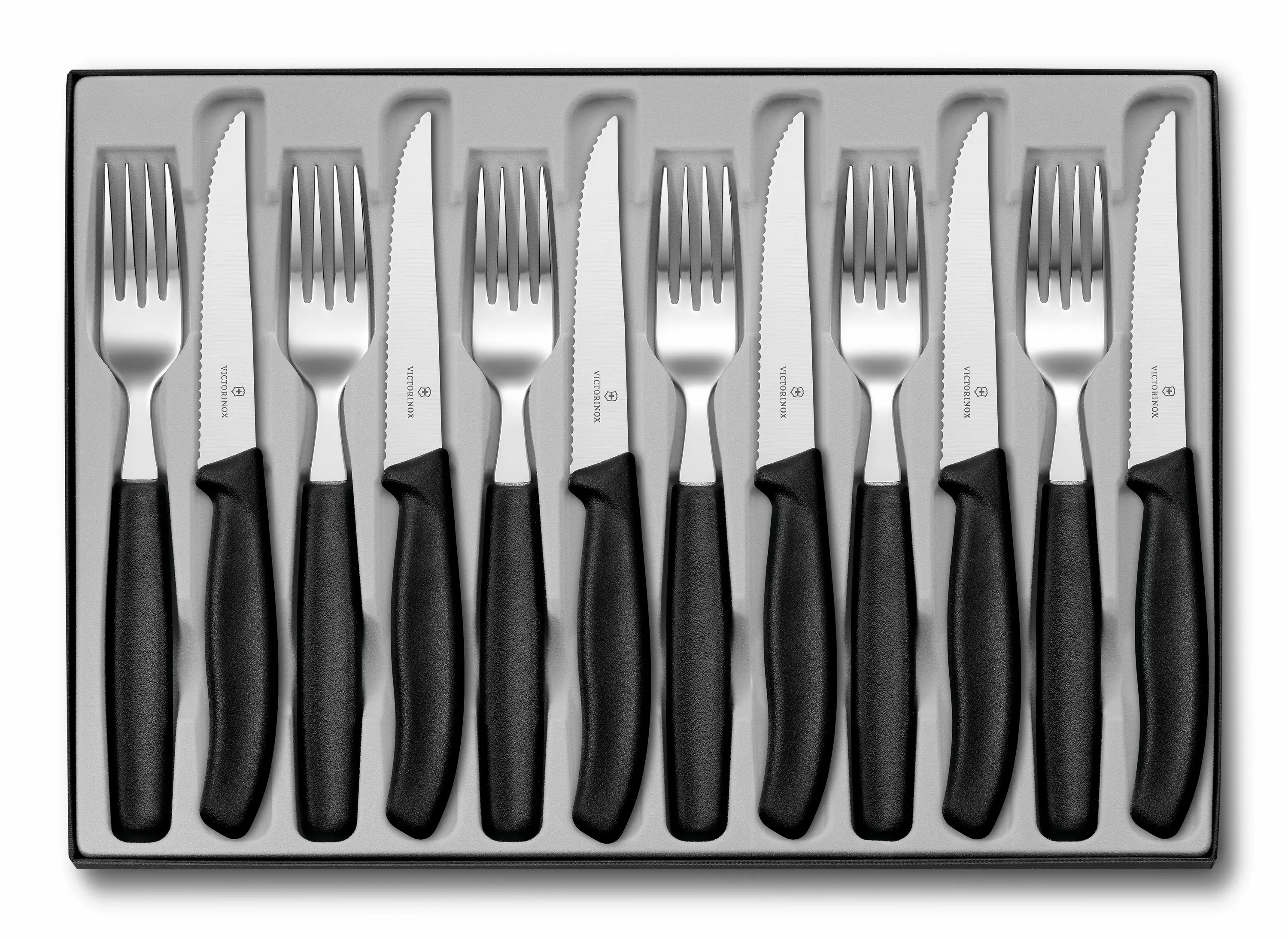 Victorinoxin korkealaatuinen ruokailuvälinesetti. Setissä on kuusi teräväkärkistä pihviveistä 11 cm terällä ja kuusi haarukkaa.