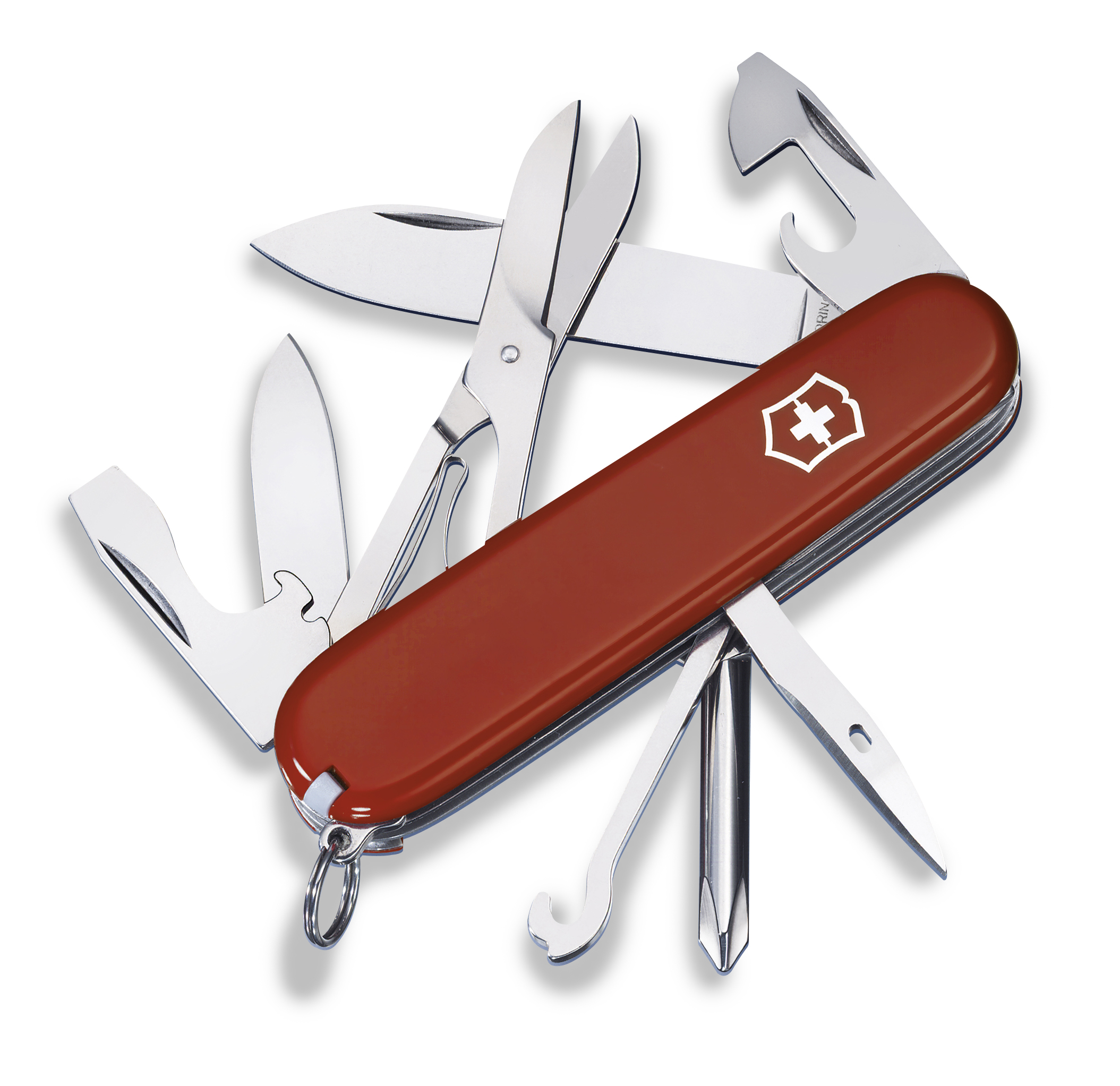 Toiminnot : 1. pitkä terä 2. lyhyt terä 3. korkkiruuvi 4. tölkinavaaja ja 5. - kapea ruuvitaltta 6. Phillips-kärki ja 7. - leveä ruuvitaltta 8. - johdon kuorija 9. naskali, purasin 10. avainrengas 11. pinsetit 12. hammastikku 13. sakset 14. monitoimikoukku