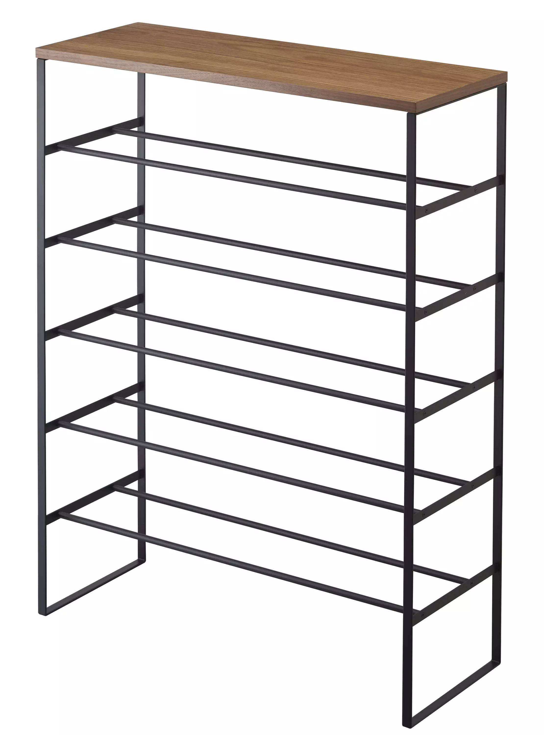 Teräsrunkoinen Tower-kenkähylly on todellinen tilaihme! Syvyyssuunnassa hylly vie tilaa vain n. 25 cm, joten se sopii kapeaankin eteiseen tai vaatehuoneeseen. Viidellä hyllyllä on tilaa ainakin 15 kenkäparille, jonka lisäksi kenkiä mahtuu myös lattialle telineen alle. Kauniin pähkinäpuisen tason päällä taas voi säilyttää vaikkapa avaimia ja aurinkolaseja. Lisäksi hyllyn päädyssä on kaksi irrotettavaa koukkua, joihin esimerkiksi sateenvarjo tai kenkälusikka on kätevä laittaa roikkumaan. Teräshyllyt on helppo pitää siistinä kostealla liinalla pyyhkimällä.