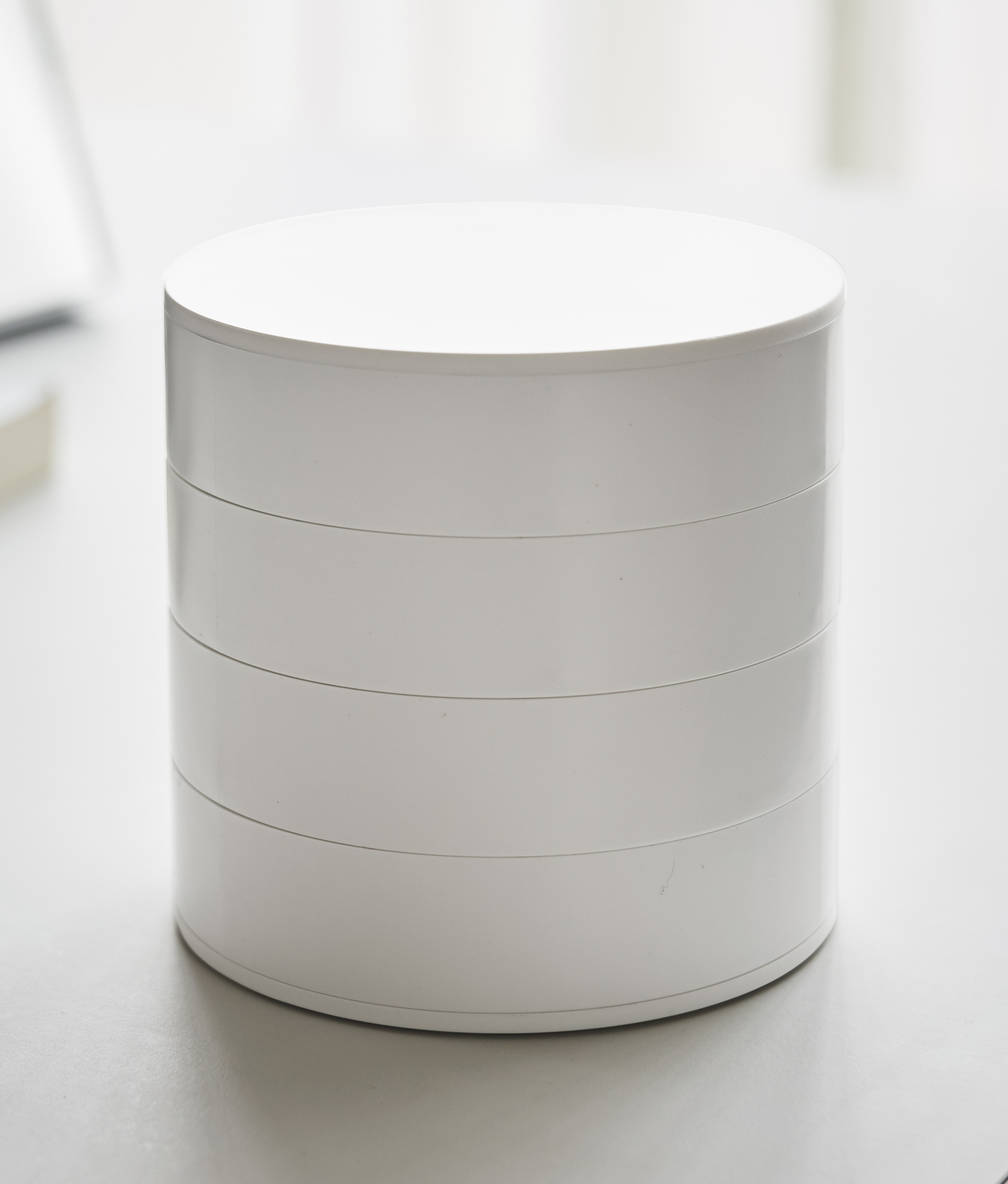 Minimalistisessa Tower-korulippaassa on neljä kerrosta, joissa korut ja muut pikkutavarat on vaivaton pitää hyvässä järjestyksessa. Kannen ansiosta myös ylin kerros on suojassa pölyltä.