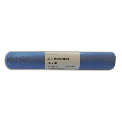 Jätesäkki 20L sininen. 50kplSininen roskapussi. Koko 420x500x0.011. mm. HD-muovia. 50 Pussia/rll. Valmistettu Suomessa.