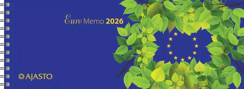 Ajasto Euro Memo -pöytäkalenteri sisältää kieliversiot suomi, ruotsi, englanti, saksa ja ranska. Monikielisyyden ansiosta Euro Memo sopii esimerkiksi monikansalliseen yritykseen, jossa tarpeen pitää säännöllistä yhteyttä ulkomaille. Ajasto Euro Memo näyttää aukeamalla täyden viikon, kolmen kuukauden seurannan sekä kuluvan viikon numeron. Kierresidotut kannet tekevät kalenterin käsittelystä helppoa ja miellyttävää. Euro Memo tärkeimmät ominaisuudet: koko 255 x 95 mm. kierresidottu. päiväkirja 51/2025–1/2027. vuosisuunnitelmat 2026 ja 2027. kansalliset vapaapäivät. kiinteä puhelinmuistio. FSC®-serfifioitu tuote. kielisyys suomi, ruotsi, englanti, saksa, ranska. kartonkikannet. muistiinpanotilaa.