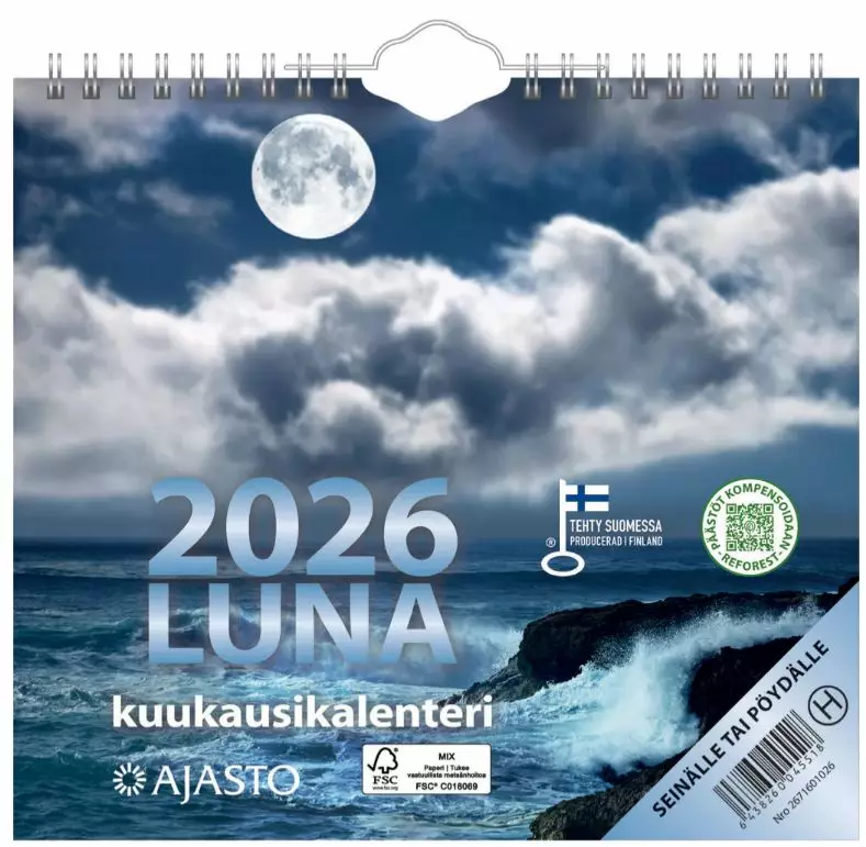 Ajasto-kalenterit ovat pääosin kotimaista tuotantoa. Kalentereiden suunnittelussa muiden muassa ekologisuus ja laatu ovat tärkeässä asemassa. Ajasto Luna seinäkalenteri painetaan sertifioidulle paperille. Sertifioidulla FSC-paperilla olet mukana edistämässä vastuullista metsänhoitoa.