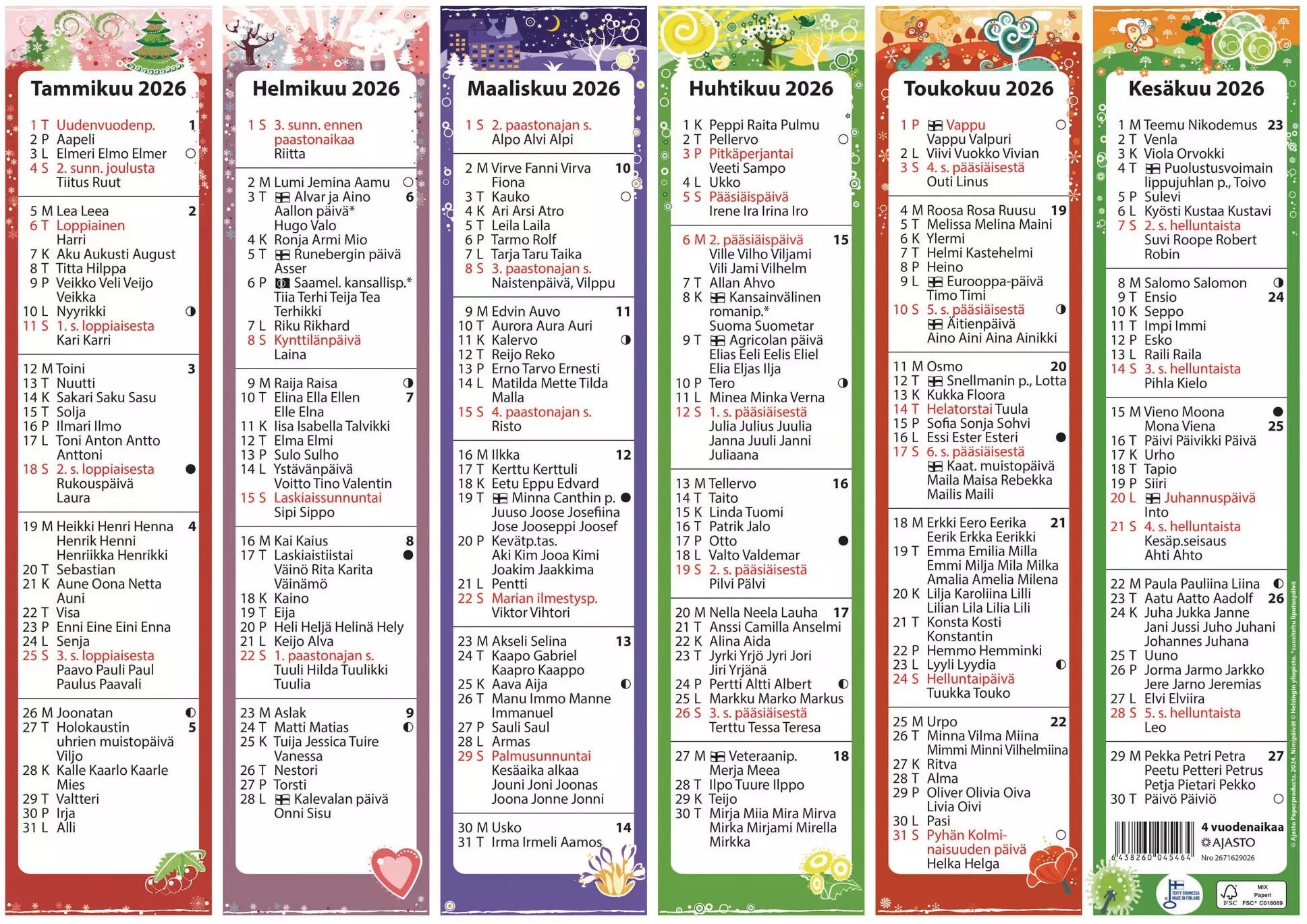 Ajasto Neljä Vuodenaikaa seinäkalenteri näyttää sinulle puoli vuotta yhdellä silmäyksellä. Kalenterin jokainen kuukausi on hyvin erottuva, kauniilla ja värikkäällä taustakuvioinnillaan. Seinäkalenteri on valmistettu tukevasta kartongista. Kalenterin näkymässä kuukaudet ovat vierekkäin ja päivät allekkain. Ajasto Neljä Vuodenaikaa tärkeimmät ominaisuudet: koko 490 x 350 mm. kirkkopyhät ja juhlapäivät. runsaasti nimipäiviä. tukevaa kartonkia. FSC®-sertifioitu tuote. puoli vuotta per puoli. Ajasto-kalenterit ovat pääosin kotimaista tuotantoa. Kalentereiden suunnittelussa muiden muassa ekologisuus ja laatu ovat tärkeässä asemassa. Ajasto Neljä Vuodenaikaa painetaan sertifioidulle paperille. Sertifioidulla FSC-paperilla olet mukana edistämässä vastuullista metsänhoitoa. Kalentereilla ei ole vaihto- eikä palautusoikeutta
