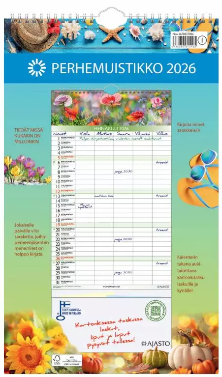 Ajasto Perhemuistikko seinäkalenteri helpottaa sinun ja perheesi arkea. Jo yhdellä silmäyksellä näet koko perheen menemiset ja tulemiset. Kirjoita kaikkien nimet kalenteriosan ylhäältä löytyviin sarakkeisiin ja lisää menot allekkaisille riveille oikean päivän kohdalle. Helppoa ja nopeaa. Kalenterissa on tukeva kierresidonta ja ripustuskoukku sekä takana muovitasku esimerkiksi laskujen säilyttämiseen. Ajasto Perhemuistikko tärkeimmät ominaisuudet: koko 250 x 415 mm. jokaiselle päivälle viisi saraketta. kätevä muovitasku laskuille ja kynälle. FSC®-sertifioitu tuote. valmistettu Suomessa. Ajasto-kalenterit ovat pääosin kotimaista tuotantoa. Kalentereiden suunnittelussa muiden muassa ekologisuus ja laatu ovat tärkeässä asemassa. Ajasto Perhemuistikko seinäkalenteri painetaan sertifioidulle paperille. Sertifioidulla FSC-paperilla olet mukana edistämässä vastuullista metsänhoitoa. Kalentereilla ei ole vaihto- eikä palautusoikeutta.