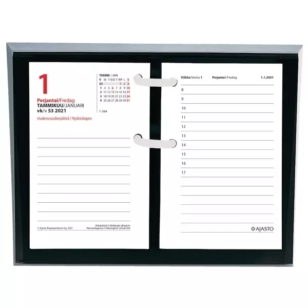 Ajasto Pöytäpäivyrin alusta musta on tarkoitettu käytettävän yhdessä 83 x 109 mm kokoisen Ajasto pöytäkalenterin kanssa. Kalenteri sopii avattuna täydellisesti alustan raameihin ja se pitää kalenterin pöydällä tukevasti paikallaan. Alusta on valmistettu muovista. Kalentereilla ei ole vaihto- eikä palautusoikeutta.