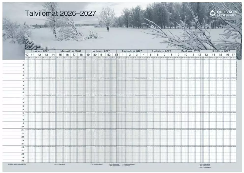 Ajasto Quo Vadis Lomakalenteri 2026–2027 seinäkalenteri 420 x 297mm
