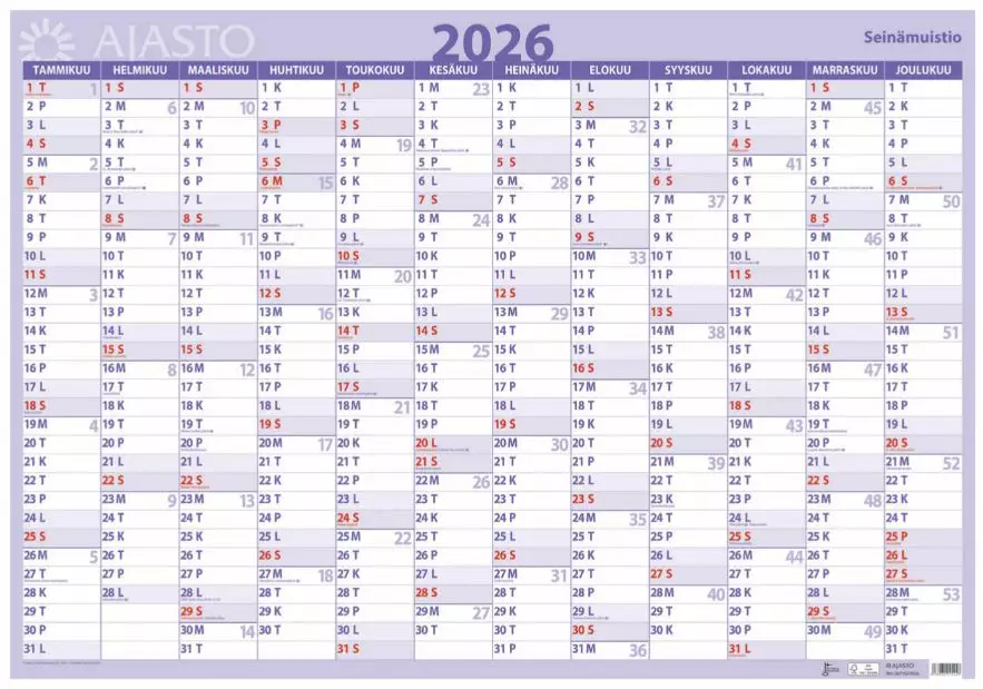 Ajasto Seinämuistio on iso, koko vuoden kattava seinäkalenteri suunnitteluun. Kalenterin näkymässä on jätetty sopivasti tilaa päiväkohtaisille pienille merkinnöille. Kalenterissa kuukaudet ovat vierekkäin ja päivät allekkain. Näkymä on selvä ja helposti erottuva. Ajasto Seinämuistio tärkeimmät ominaisuudet: koko 850 x 590 mm kääntöpuolella sekä suomen- että ruotsinkieliset pienennetyt kalenterit juhlapäivät merkitty punaisella. muistiinpanotilaa joka päivälle. kielisyys suomi ja ruotsi. FSC®-sertifioitu tuote. Ajasto-kalenterit ovat pääosin kotimaista tuotantoa. Kalentereiden suunnittelussa muiden muassa ekologisuus ja laatu ovat tärkeässä asemassa. Ajasto Seinämuistio painetaan sertifioidulle paperille. Sertifioidulla FSC-paperilla olet mukana edistämässä vastuullista metsänhoitoa. Kalentereilla ei ole vaihto- eikä palautusoikeutta.