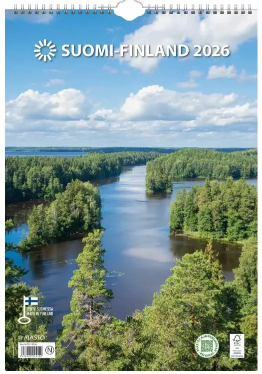 Ajasto Suomi seinäkalenteri on luontoystävän suosikkikalenteri. Kuvillaan se tarjoaa kappaleen kauneinta Suomea, kaikkina eri vuodenaikoina. Henkeäsalpaavat maisemat sykähdyttävät kuukauden jokaisena päivänä, ja jokaisena kuukautena. Vaikka kalenterinäkymässä kuvat ovat pääosassa, jää myös päiville hyvin tilaa, ja ne erottuvat toisistaan selkeästi. Seinäkalenterissa on tukeva kierresidonta ja ripustuskoukku. Ajasto Suomi tärkeimmät ominaisuudet: koko 290 x 415 mm (A3). kierresidottu. taustapahvissa värillinen Suomen kartta. FSC®-sertifioitu tuote. valmistettu Suomessa. kielisyys suomi ruotsi englanti. Ajasto-kalenterit ovat pääosin kotimaista tuotantoa. Kalentereiden suunnittelussa muiden muassa ekologisuus ja laatu ovat tärkeässä asemassa. Ajasto Suomi seinäkalenteri painetaan sertifioidulle paperille. Sertifioidulla FSC-paperilla olet mukana edistämässä vastuullista metsänhoitoa. Kalentereilla ei ole vaihto- eikä palautusoikeutta.