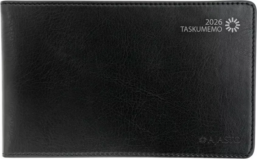Ajasto Taskumemo 2026 on keinonahkakantinen taskukalenteri koossa 148 x 90 mm. Aukeamallaan Taskumemo näyttää viikon vaakasuuntaisena. Vaakanäkymä jättää päiväkohtaisesti reilusti tilaa omille merkinnöille, päivät myös erottuvat toisistaan selvästi. Aukeamalta näet lisäksi kuluvan viikon sekä kahden kuukauden seurannan.