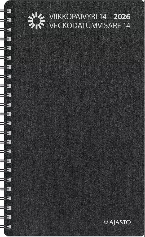 Ajasto Viikkopäivyri 14 näyttää aukeamalla kaksi viikkoa. Päivät ovat allekkain ja jokaiselle päivälle jää vaakasuunnassa tilaa omille merkinnöille. Kapean muotonsa ansiosta kalenteria on helppo kuljettaa mukana ja säilyttää pienemmälläkin pöydällä. Viikkopäivyrissä on tummanharmaan kartonkikannet. Ajasto Viikkopäivyri 14 tärkeimmät ominaisuudet: koko 120 x 210 mm. päiväkirja 52/2025–53/2026. vuosisuunnitelmat 2026 ja 2027. kaksi viikkoa aukeamalla. suomalaiset ja suomenruotsalaiset nimipäivät. kuluvan ja seuraavan vuoden yleiskalendaariot. liputuspäivät Suomessa. kansalliset vapaapäivät. kiinteä puhelinmuistio. FSC®-serfifioitu tuote. kielisyys suomi ja ruotsi.