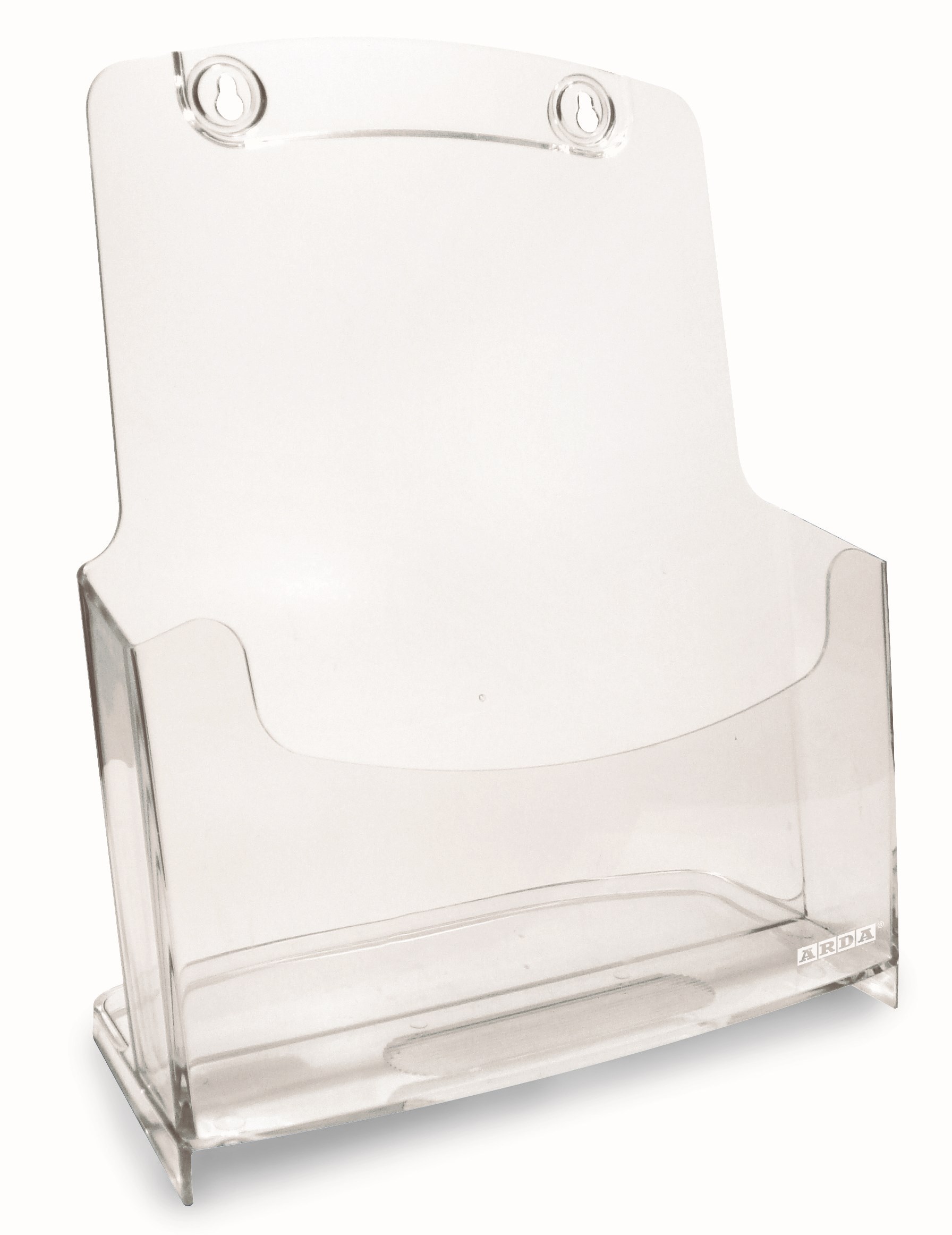 Esiteteline lentolehtisten, esitteiden, aikakauslehtien ja muiden esillepanoon. Valmistettu lasikirkkaasta polystyreenistä.