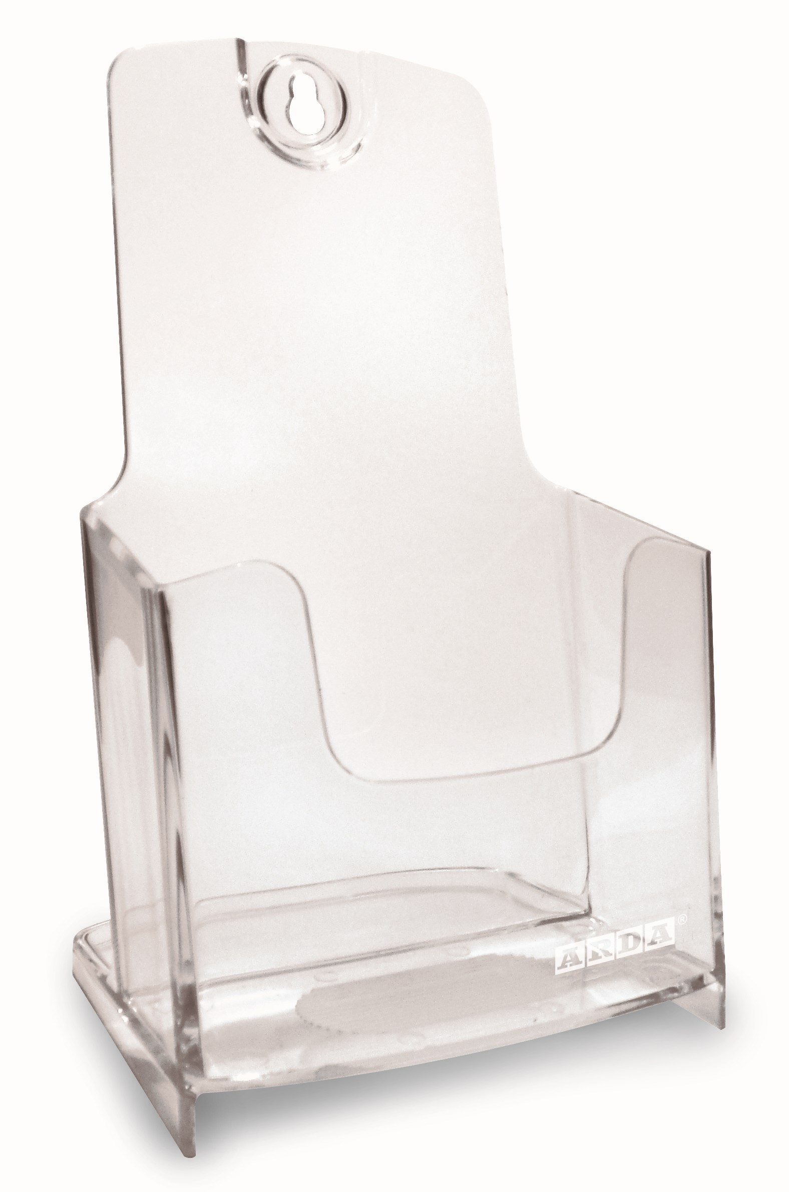 Esiteteline lentolehtisten, esitteiden, aikakauslehtien ja muiden esillepanoon. Valmistettu lasikirkkaasta polystyreenistä.