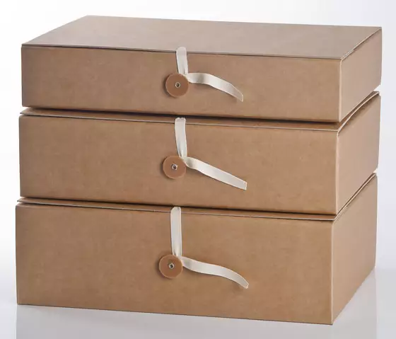 Asiakirjojen pitkäaikaiseen säilytykseen. Valmistettu ruskeasta 1,5 mm vahvuisesta voimapahvista. Raaka-aineesta osa kierrätyspahvia. Suljentanauhan päällä on paperinen suojatarra. Selän leveys 6 cm. Kiinnitys nappi/nauha.