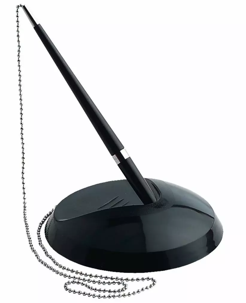 Kynätelineen pohjassa on kaksipuolinen teippi, jolla telineen voi kiinnittää tukevasti pöytään. 57-senttisellä metalliketjulla alustaan kiinnitetyn kynän mukana tulee 2 vaihtosäiliötä, joten musta muste ei lopu heti kesken.
