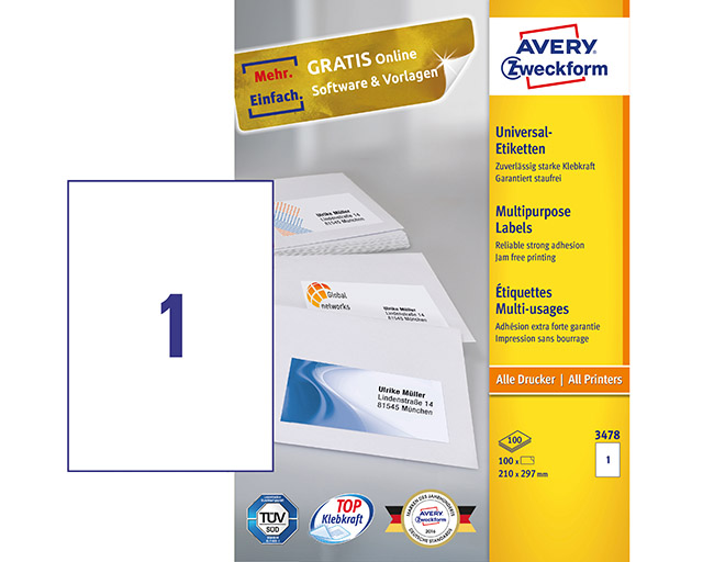 AVERY 3478 MONIKÄYTTÖTARRA 210X297MM. 1-jakoinen A4 (210x297mm) tarra. Paketissa 100 tarraa. Monikäyttöiset tarrat soveltuvat mustesuihku- ja lasertulostimiin sekä kopiokoneisiin. Helppo tulostaa ja hyvä käytettävyys. Erinomainen tartunta. Väri: valkoinen. FSC-sertifioitu.