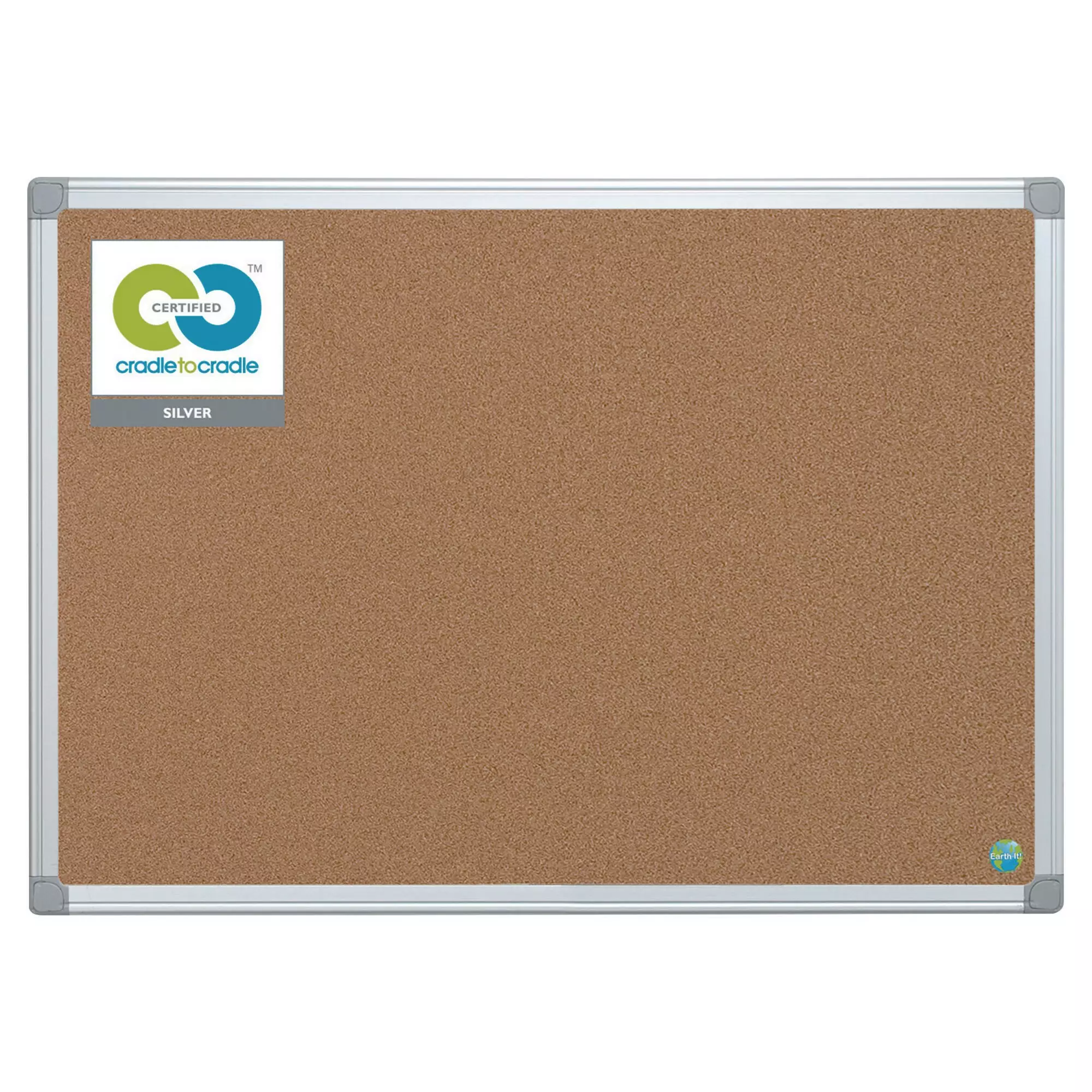 Taulun pinta on valmistettu korkista ja siinä on harmaat alumiinikehykset.