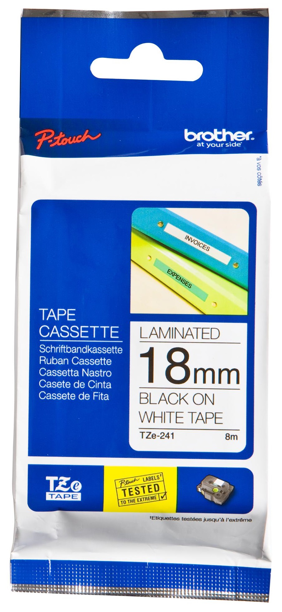 Alkuperäinen laminoitu TZe241-tarranauha sopii useisiin Brother P-touch-tarratulostimiin. Tarran musta teksti valkoisella pohjalla on erittäin selkeä, joten tarra sopii käyttöön niin kotona kuin työpaikalla.
