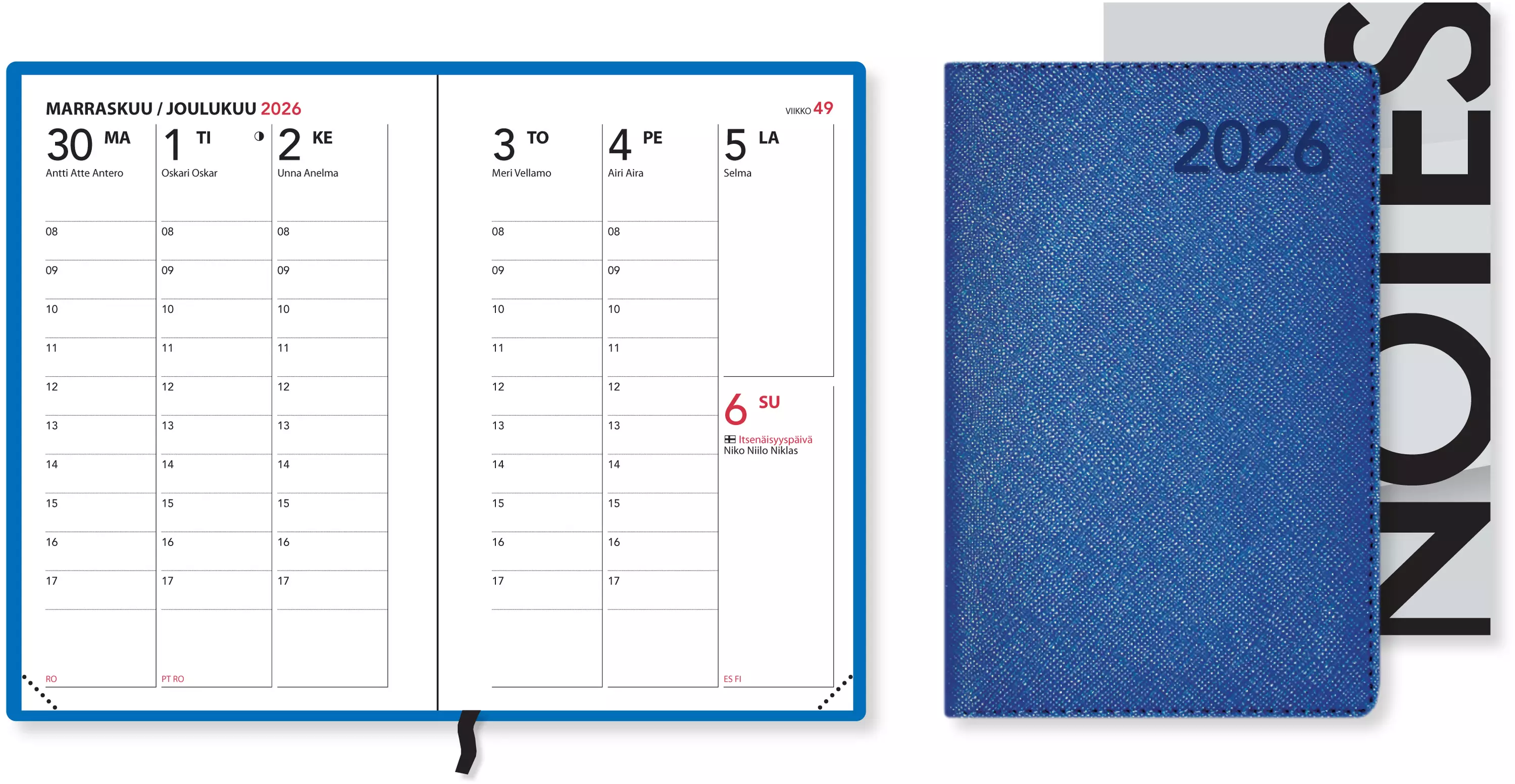Sopivasti taskuun mahtuva koko 82 x 123 mm, viikot 50/2025-1/2027, vuosisuunnittelu 2026 myös näppäränä ulostaitettavana versiona. Viikko aukeamalla, tunnit 8-17, liputuspäivät, kansalliset pyhät aukeamilla ja luettelona, nimipäivät, vuosisuunnittelu 2027 ja infosivuja. Runsaasti tuntikohtaista kirjoitustilaa, tehtäväluettelot. Siirrettävä Notes-muistio. Lukunauha ja kulmaperforointi, ommeltu. Tyylikäs sininen keinonahkakansi. Suomenkielinen.
