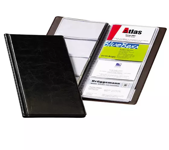 Album VISIFIX® 96 leather look. Visifix käyntikorttikansio 96 kortille (57x90mm). Mustat kovat muovikannet.