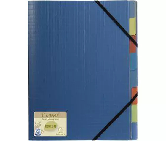 Esijärjestin A4-koon dokumenteille. 8-osainen. Kannen väri sininen, välilehdet eriväriset. Kuminauhasuljenta. Valmistettu 100% kierrätetystä polypropeenimuovista. Vahvuus 0,7 mm. Mitat 240 x 320 mm.