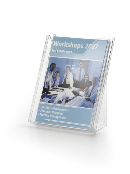 Esiteteline, jota voi pitää pöydällä. Pakkauksessa yksi teline, joihin mahtuu 24 mm:n paksuudelta esitteitä. Esitteiden koko A4 tai maksimi 311x240 mm.