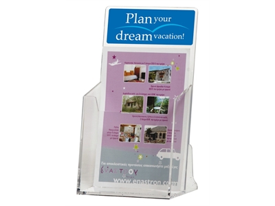 Pöydällä pidettävä esiteteline A5-kokoisille esitteille. Telineeseen mahtuu n. 3 cm nippu esitteitä. Koko L165xS73xK210mm. Materiaali polystyreeni.