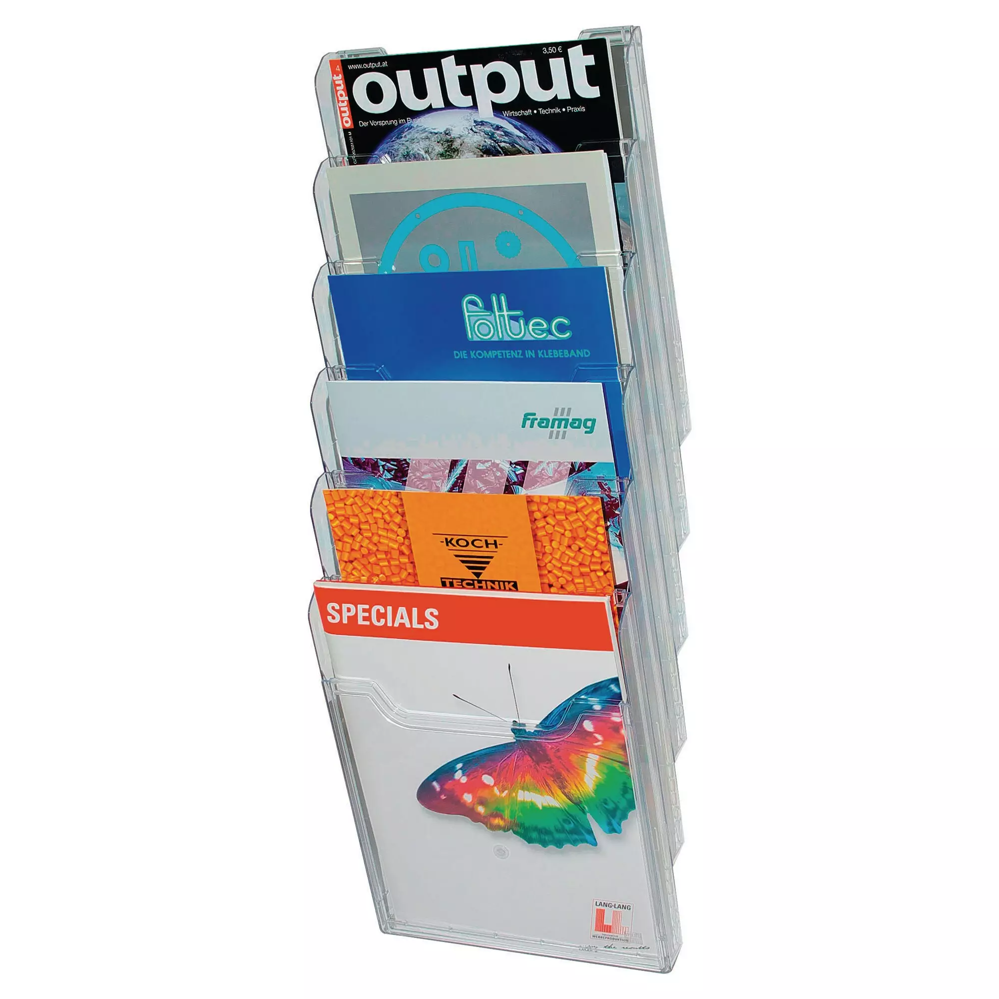 Aseta lehdet, kuvastot ja esitteet näppärästi esille Exacomptan seinätelineellä. 6-osainen teline sopii A4-kokoisille dokumenteille. Moduuleita voidaan myös liittää toisiinsa. Mukana tulee etikettipidike ja seinäkiinnitystarvikkeet. Toimitetaan koottuna.