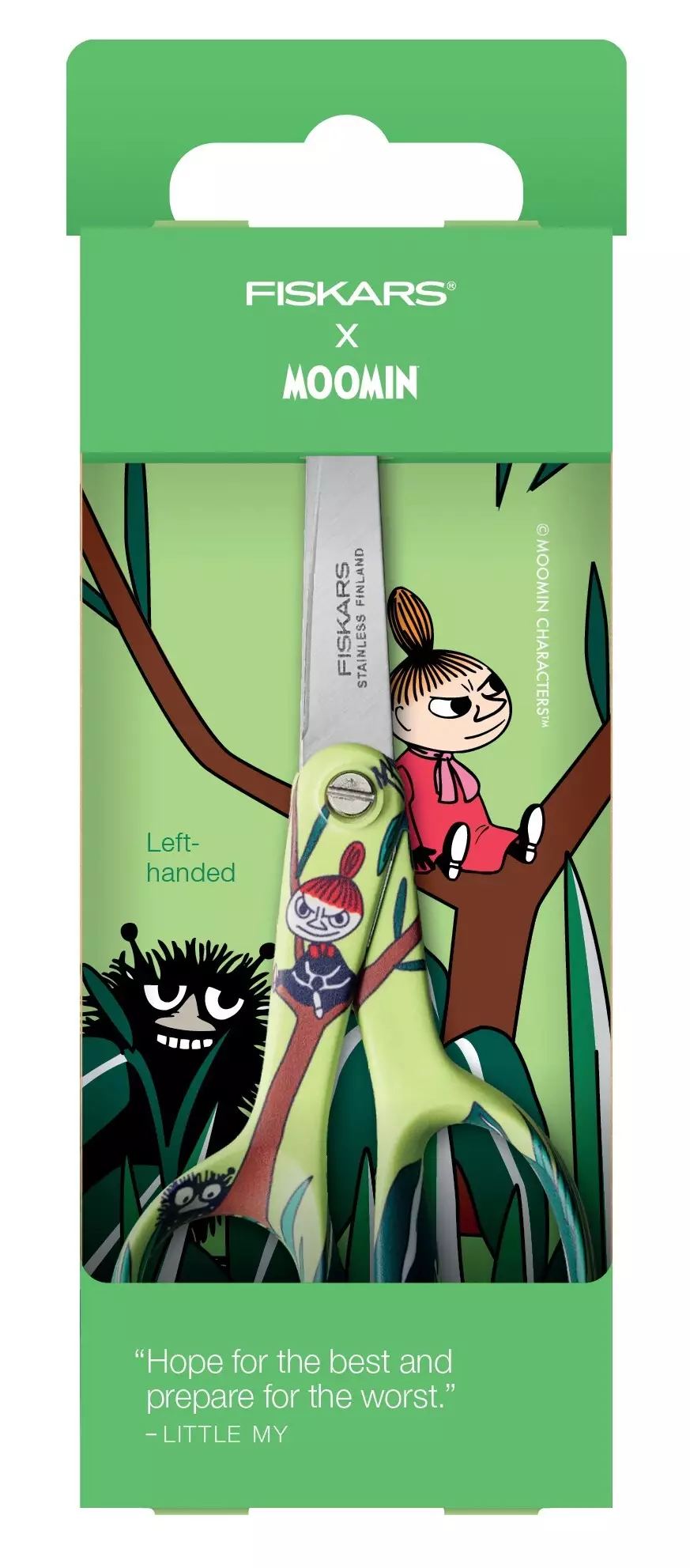 "Ja sitten pyydät anteeksi ja annat heille makeisia." – Pikku Myy Hurmaavat ja ihanan omaperäiset Muumi-hahmot heräävät eloon leikkisissä Fiskars-saksissa. Nämä vasenkätiset Fiskars X Moomin Pikku Myy -sakset on suunniteltu lasten pienille käsille ja luoville mielille aina yhtä pippurisen ja määrätietoisen Pikku Myyn inspiroimana. Näillä saksilla askartelua on helppo harjoitella, sillä saksissa on innovatiiviset, pyöristetyt terät. Isompi sormirengas ja ergonominen peukalorengas tarjoavat parhaan mahdollisen tuen lasten sormille. Terien optimaalinen avauskulma tekee saksien käyttämisestä helpompaa, estää otteen lipsumisen ja takaa paremman kontrollin. Saksien terät ja kahvat ovat suorassa linjassa, mikä helpottaa leikkaamista pystysuunnassa. Sakset on suunniteltu neljävuotiaille ja sitä vanhemmille lapsille, koska jokainen luova nero ansaitsee omalle tasolleen sopivat sakset. Suunniteltu Suomessa, testattu käsin.