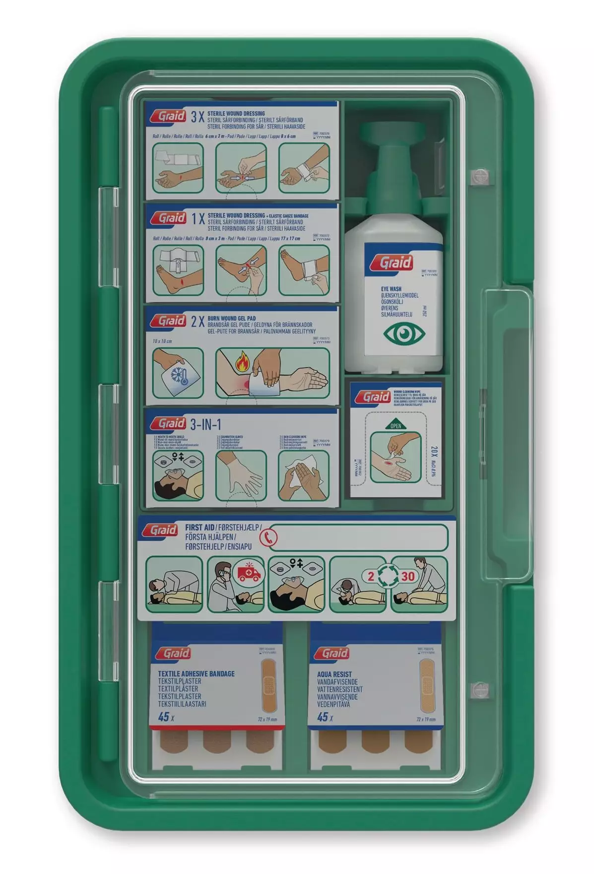 Tämä Graid silmähuuhteella ensiapuasema on tärkeä apuväline, jonka avulla pienet lääketieteelliset tarpeet voidaan hoitaa nopeasti ja tehokkaasti. Se on suunniteltu tukemaan nopeaa reagointia erilaisiin työtapahtumiin ja varmistamaan, että jokaisella työntekijällä on käytettävissään välttämättömät hoitotarvikkeet viipymättä. Tärkeimmät ominaisuudet: Graid ensiapuasema. Silmähuuhde. Ensiapuasema yrityksessä mahdollistaa nopean avun tapaturmien sattuessa, mikä vähentää vakavien vammojen riskiä ja parantaa työntekijöiden turvallisuutta. Se täyttää lakisääteiset vaatimukset ja lisää työpaikan yleistä hyvinvointia. Ensiapuasema voi myös vähentää sairauspoissaoloja ja parantaa yrityksen tuottavuutta. Ota hätätilanteet haltuun ja pidä ensiapuasema aina käden ulottuvilla. Tuotepakkauksen sisältö: 1 x 3 pieni haavaside, 1 x iso haavaside, 1 x 2 palova mman geelityyny, 1 x 3-in-1 suusta suuhun elvytyspakkaus, 1 x silmähuuhde, 1 x 20 haavan puhdistuslaput, 1 x ensiapuohje, 1 x 45 tekstiililaastari ja 1 x 45 vedenpitävä laastari.