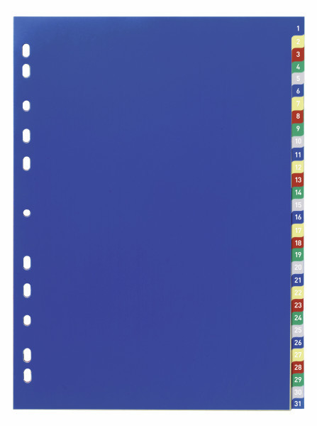 Hakemisto värillisillä välilehdillä ja kansilehdellä. A4, välilehdet painettu painikkeilla 1-31. Universal lävistys. Voidaan tulostaa Duraprintin avulla.
