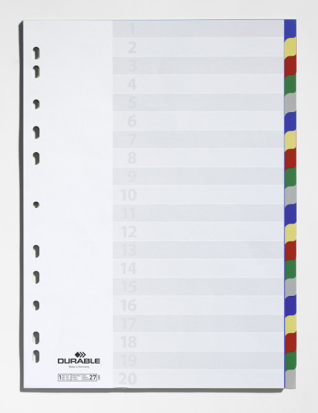 A4-koon polypropeenihakemisto 20 värillisillä välilehdillä ja kansilehdellä rei'itetyille taskuille. Universaali lävistys.
