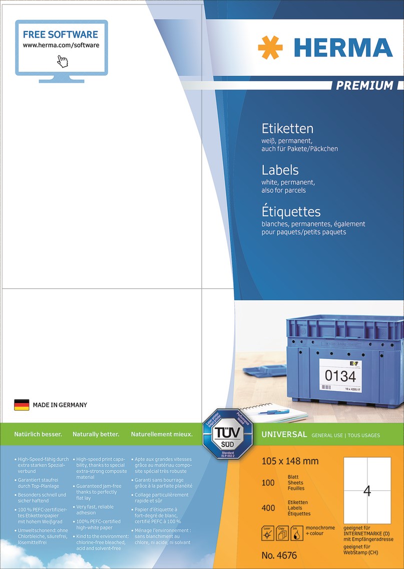 Itsekiinnittyvät etiketit A4-arkeille, pysyvä tarttuvuus. Täydellinen kaikille lasertulostimille ja mustesuihkutulostimille, kopiokoneille, värilasertulostimille ja värikopiokoneille. Nopea suorituskyky takaa erityisen tukevan erikoislaminaatin, täydellisen tasaisen asennuksen ja monipuolisen suojareunan. Häiriötön tulostus lasertulostimilla ja mustesuihkutulostimilla, TÜV SÜD: n testaama ja sertifioima. Korkea valkoisuus ja tasainen pinta takaavat täydellisen tulostuksen mustavalkoisena tai värillisenä. Selvästi paksumpi: erittäin vahvat tarrat - helppo kiinnittää. Erittäin nopea, luotettava tarttuvuus myös viileillä, kosteilla pinnoilla. Ympäristöystävällinen ja kestävä: klooriton valkaistu, PEFC-sertifioitu, liuottimeton liima. Tarrat ovat 100% kierrätettäviä, hävitettävä kuten jätepaperi, kierrätetystä pahvista tehdyt pakkaukset. Ilmaiset ohjelmistoratkaisut: www.herma.com/software.