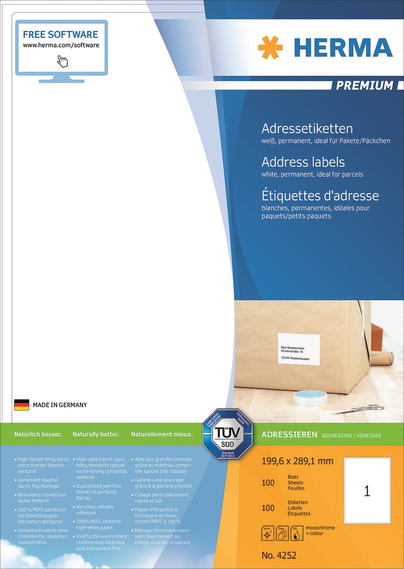 Itsekiinnittyvät etiketit A4-arkeille, pysyvä tarttuvuus. Täydellinen kaikille lasertulostimille ja mustesuihkutulostimille, kopiokoneille, värilasertulostimille ja värikopiokoneille. Nopea suorituskyky takaa erityisen tukevan erikoislaminaatin, täydellisen tasaisen asennuksen ja monipuolisen suojareunan. Häiriötön tulostus lasertulostimilla ja mustesuihkutulostimilla, TÜV SÜD: n testaama ja sertifioima. Korkea valkoisuus ja tasainen pinta takaavat täydellisen tulostuksen mustavalkoisena tai värillisenä. Selvästi paksumpi: erittäin vahvat tarrat - helppo kiinnittää. Erittäin nopea, luotettava tarttuvuus myös viileillä, kosteilla pinnoilla. Ympäristöystävällinen ja kestävä: klooriton valkaistu, PEFC-sertifioitu, liuottimeton liima. Tarrat ovat 100% kierrätettäviä, hävitettävä kuten jätepaperi, kierrätetystä pahvista tehdyt pakkaukset. Ilmaiset ohjelmistoratkaisut: www.herma.com/software.
