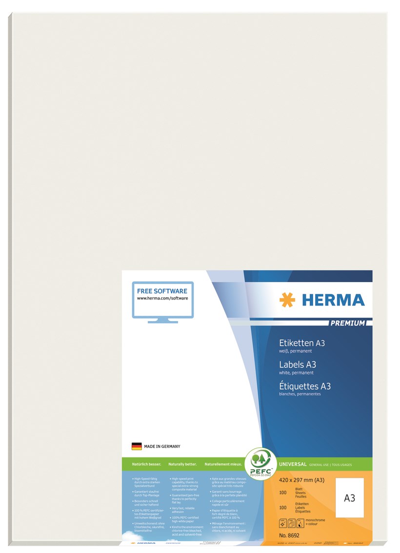 Itsekiinnittyvät etiketit A3-arkeille, pysyvä tarttuvuus. Täydellinen kaikille lasertulostimille ja mustesuihkutulostimille, kopiokoneille, värilasertulostimille ja värikopiokoneille. Nopea suorituskyky takaa erityisen tukevan erikoislaminaatin, täydellisen tasaisen asennuksen ja monipuolisen suojareunan. Korkea valkoisuus ja tasainen pinta takaavat täydellisen tulostuksen mustavalkoisena tai värillisenä. Selvästi paksumpi: erittäin vahvat tarrat - helppo kiinnittää. Erittäin nopea, luotettava tarttuvuus myös viileillä, kosteilla pinnoilla. Ympäristöystävällinen ja kestävä: klooriton valkaistu, PEFC-sertifioitu, liuottimeton liima. Tarrat ovat 100% kierrätettäviä, hävitettävä kuten jätepaperi, kierrätetystä pahvista tehdyt pakkaukset. Ilmaiset ohjelmistoratkaisut: www.herma.com/software.