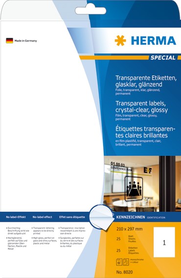 Kiiltävä, täydellinen sovelluksiin, joissa visuaalinen ulkonäkö on erityisen tärkeä. Ihanteellinen lasin ja kiiltävien pintojen muovi-, metalli- ja värillisille taustoille. Tyylikkäinä tuotemerkintöinä esitysasiakirjoille ja lahjapakkauksille, toimistovälineiden merkinnöille, näyttöikkunoiden merkinnöille, oviaukkoille tai osoitteille. Ei etikettivaikutusta: kirjoitus näyttää siltä, että se olisi painettu suoraan tuelle. Säänkestävä, vanhentamiskestävä, öljyä ja likaa hylkivä, märkäpyyhettävä. Virheetön käsittely monipuolisen suojareunan ja optimaalisen tasaisuuden ansiosta. Lasertulostimille ja kopiokoneille, värilasertulostimille ja värikopiolaitteille. Ei sovellu mustesuihkutulostimiin. Ilmaiset ohjelmistoratkaisut: www.herma.com/software.